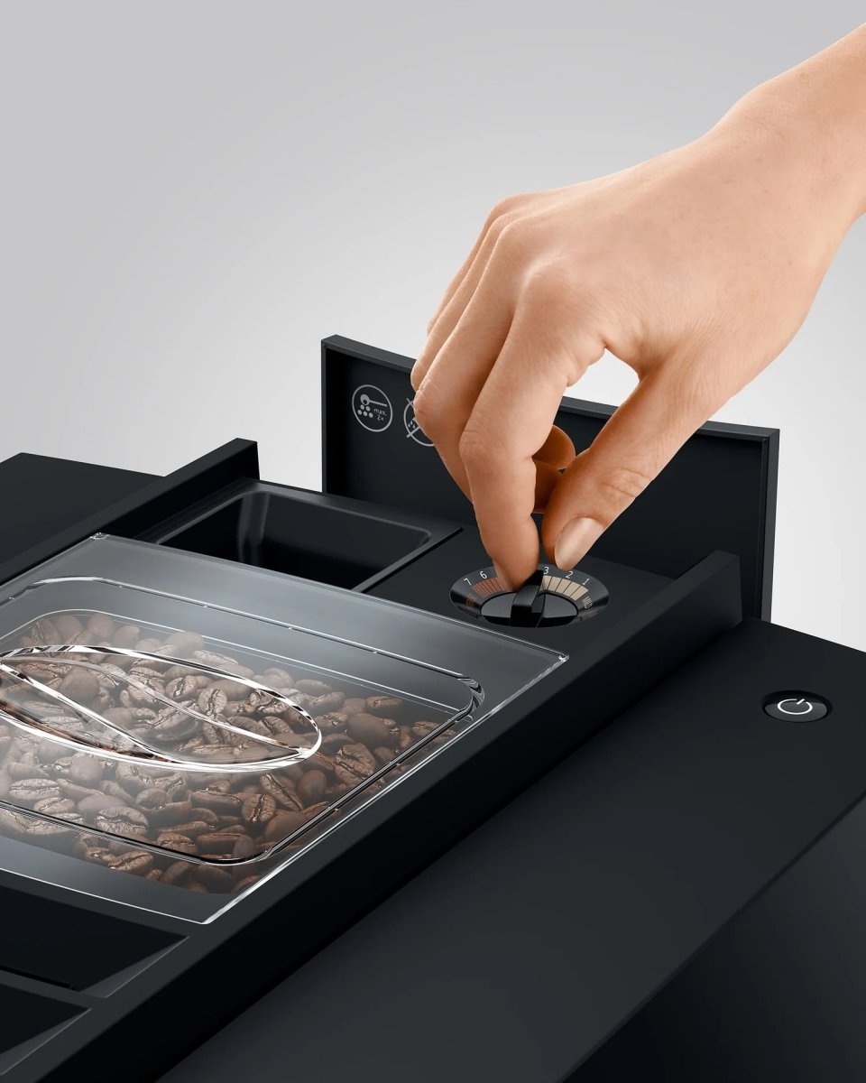 The Jura E8 is equipped with the state-of-the-art P.A.G.2+ grinder, which guarantees consistent and precise grinding. The grinder’s settings can be adjusted at any time via an ergonomic lever, ensuring that every coffee variety is ground to perfection. The resting position between uses helps to preserve the grinder, extending its lifespan and ensuring that your coffee retains its full aroma and flavor.
