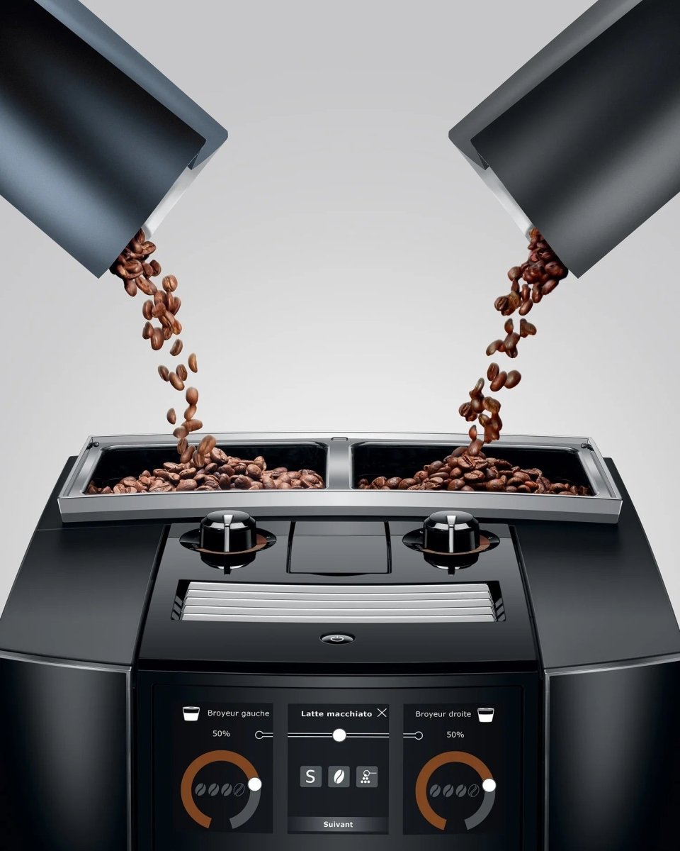 Craving a specialty coffee with or without caffeine? Need a bold dark roast for an espresso or a gentle blend for a lungo? The JURA J8 twin, featuring two precision grinders, is the answer. Essentially combining two machines in one, it eliminates the need to choose and offers unmatched versatility.