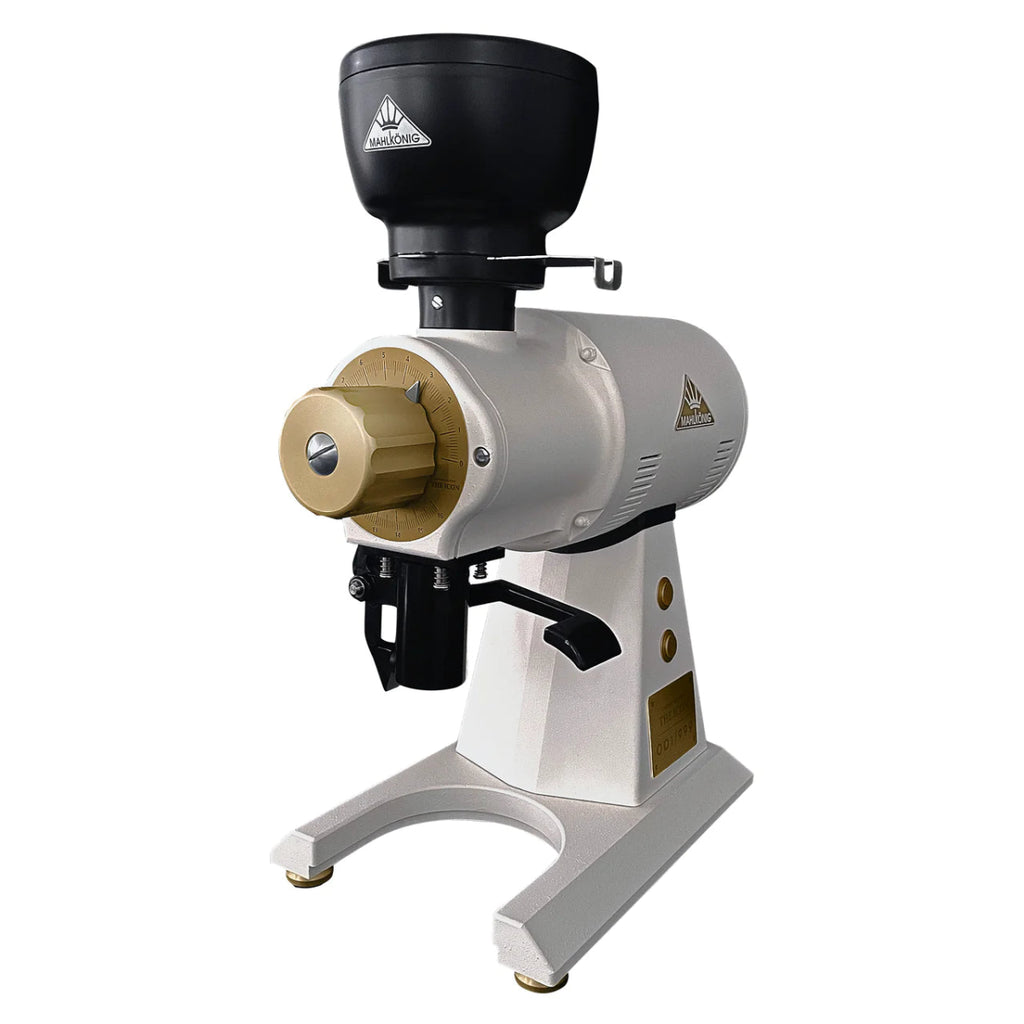 - Luxurious gold accents on the On/Off buttons, knob, dial setting plate, Mahlkonig logo, and grinder feet