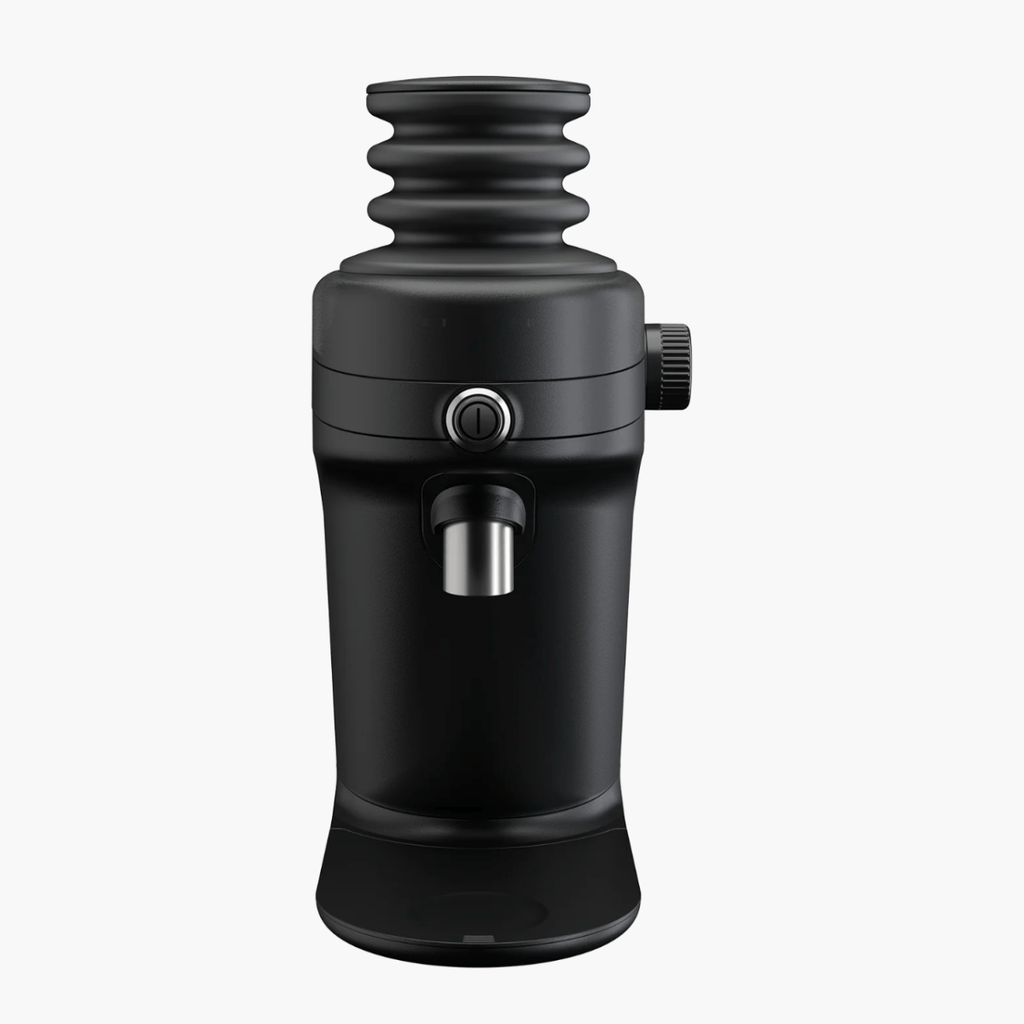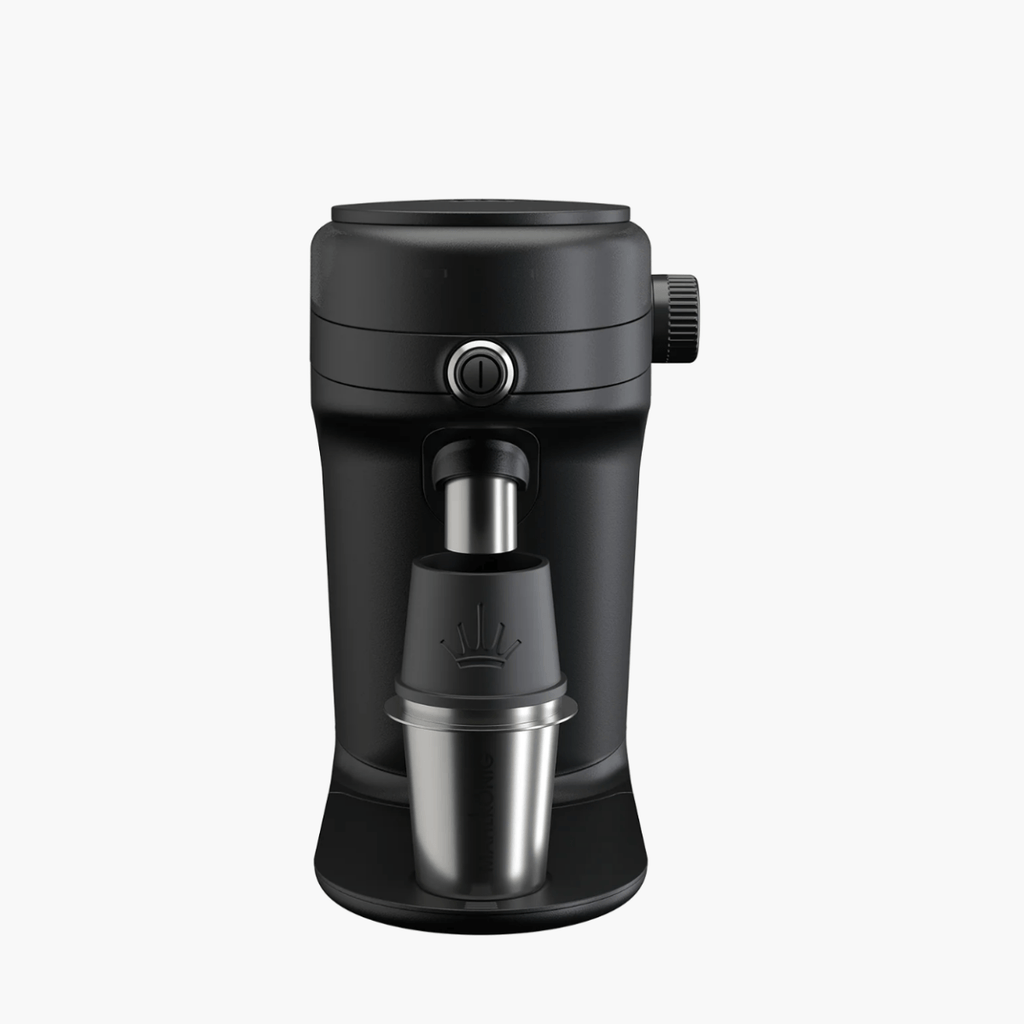 The grinder also includes multiple hopper options: a 34 g anti-popcorning top, a 105 g extension for larger quantities, and a bellow to clear out remaining grounds. A stainless steel dosing cup and anti-static funnel come standard, creating a smooth and professional workflow at home.