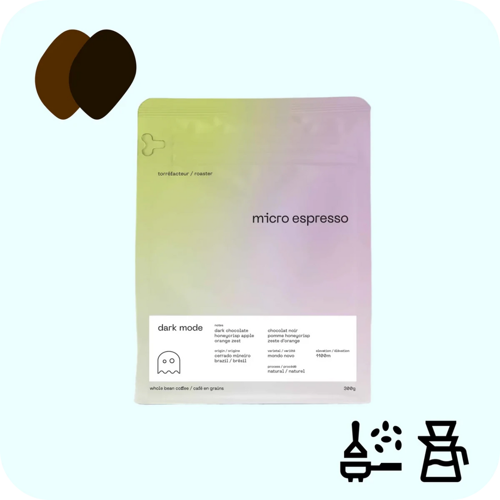This coffee is our homage to tradition, a modern interpretation of a timeless classic. Perfect for espresso and milky drinks, Mode Noir is a single-origin coffee that's chocolatey, tangy, and full-bodied. The low altitude and terroir of these beans, their natural process, combined with a medium-dark roast profile, create a rich, complex, and juicy coffee perfect for any occasion. Whether you're craving a comforting, non-acidic brew, our Mode Noir has you covered. It's excellent brewed, filtered, French pressed, and all other styles, black or with your choice of milk.